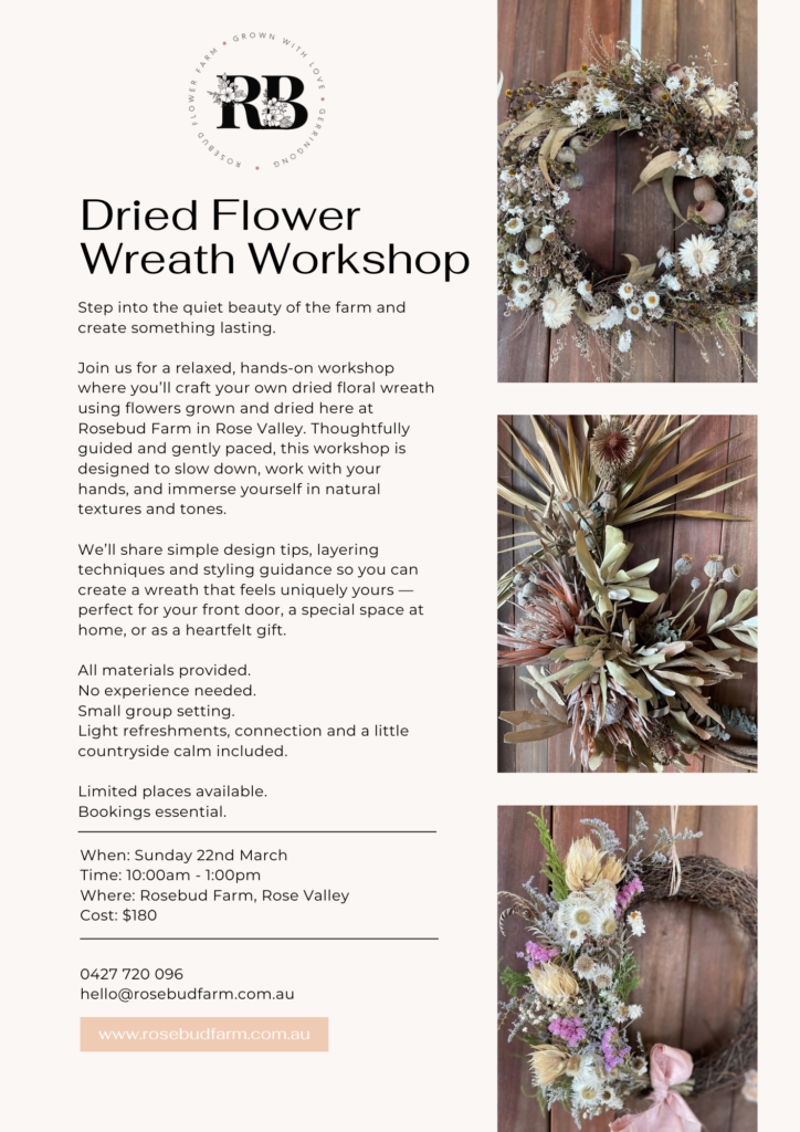 Held amongst the gardens in Rose Valley, each gathering is designed to feel relaxed, welcoming and hands-on. Whether we’re creating dried wreaths, seasonal arrangements or working with freshly harvested blooms, our workshops are centred around slowing down, learning simple floral techniques and enjoying the quiet joy of making something beautiful with your own hands.